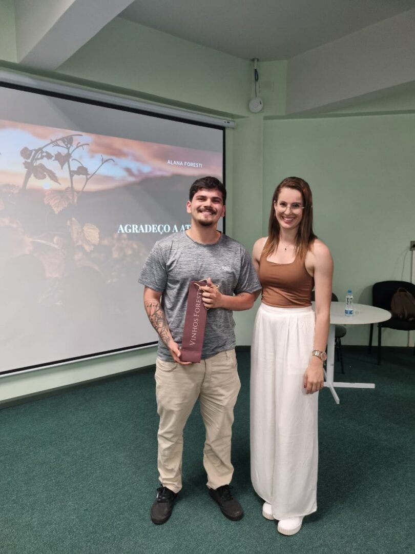 Esses conceitos foram ilustrados através do caso prático da vinícola familiar da palestrante, proporcionando vivências valiosas para os alunos de Logística e Eventos sobre os desafios e oportunidades do setor vitivinícola regional.