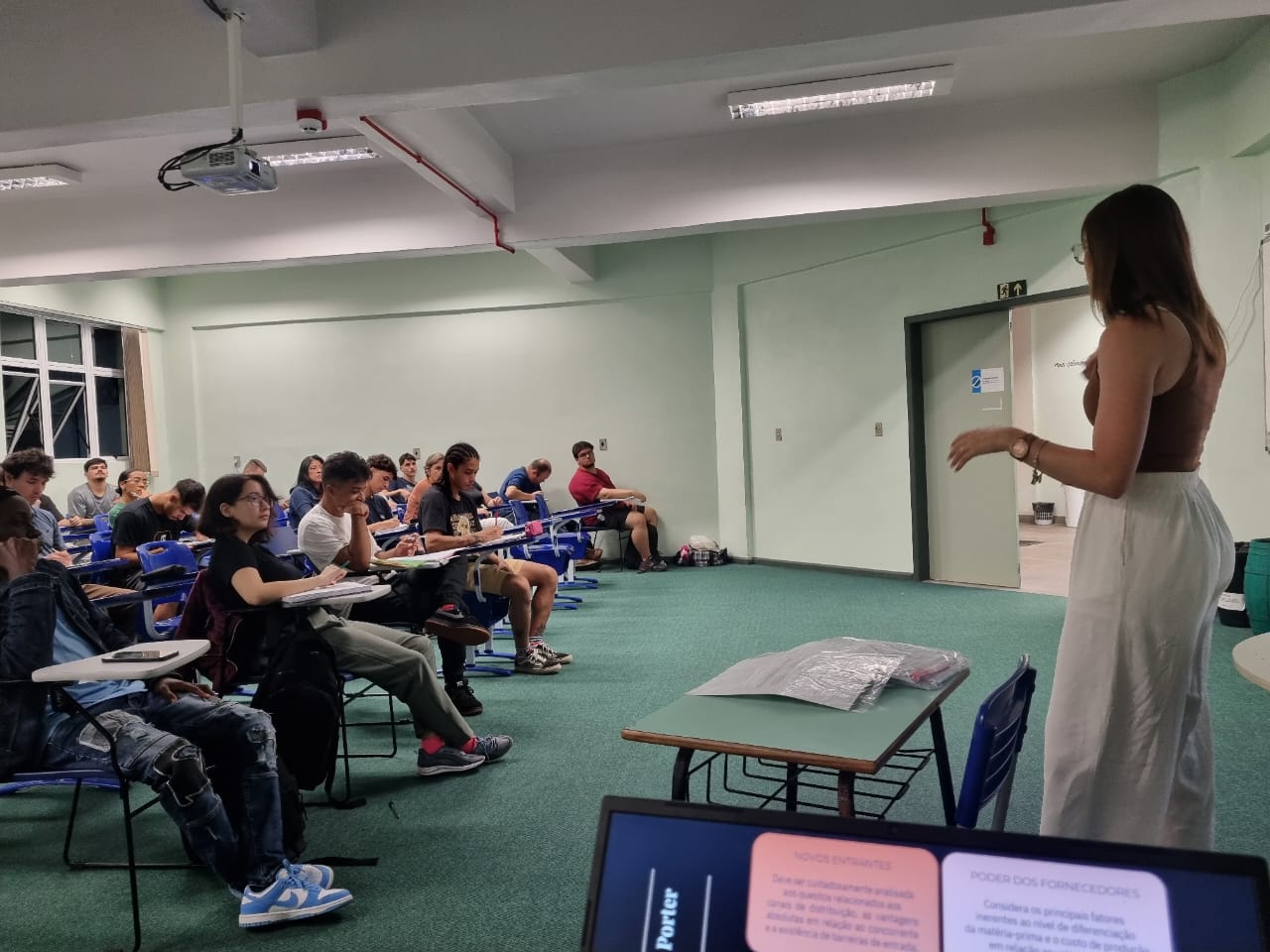 Durante a palestra, os futuros profissionais puderam observar a aplicação real de ferramentas clássicas de gestão, tais como Análise SWOT, 5 Forças Competitivas de Porter, Matriz BCG e Estratégias Genéricas.