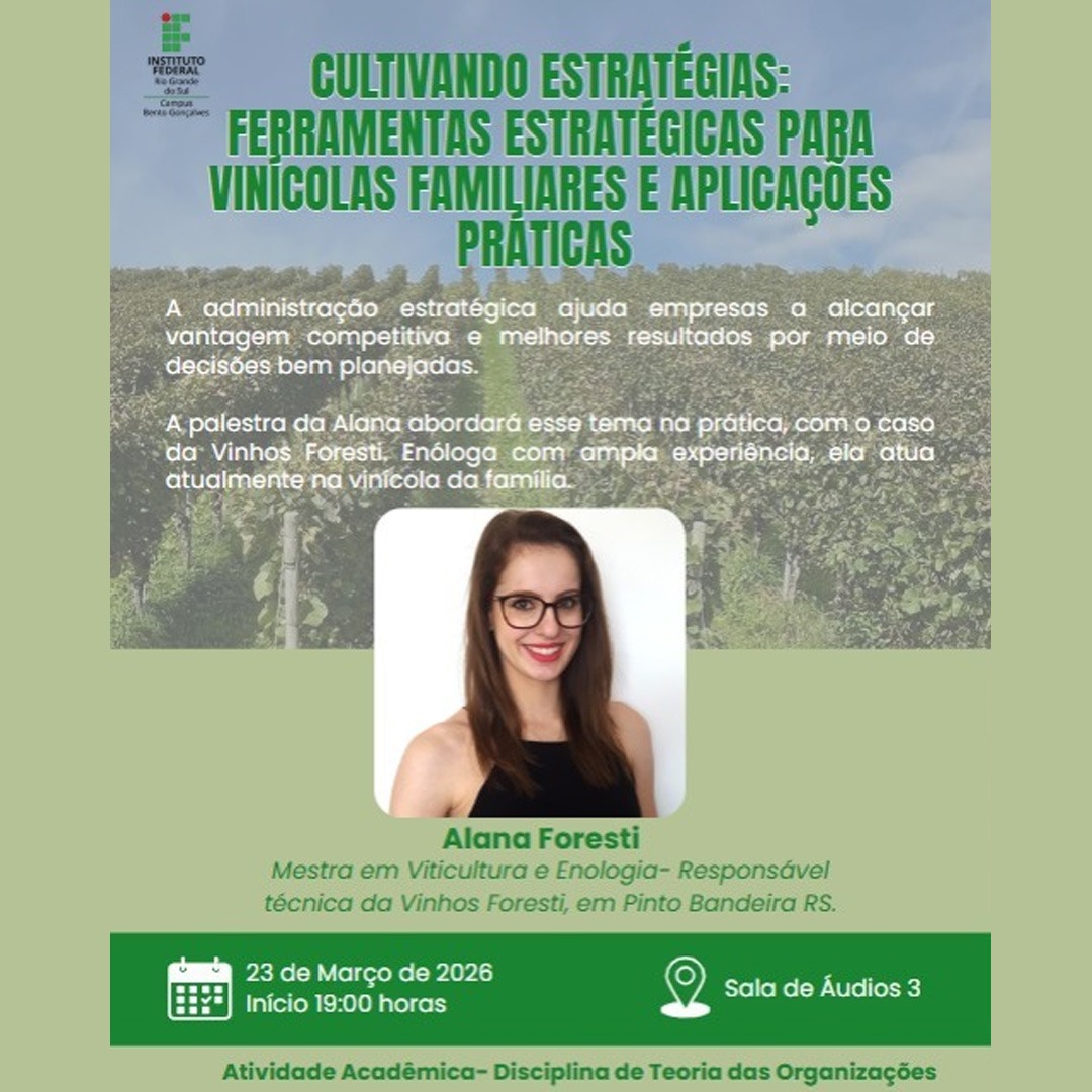No dia 23 de março de 2026, a Sala de Áudios 3 do Campus Bento Gonçalves sediou a palestra “Cultivando estratégias: ferramentas estratégicas para vinícolas familiares e aplicações práticas”. O evento foi ministrado por Alana Foresti, egressa da instituição e atual enóloga responsável técnica na vinícola Vinhos Foresti, de Pinto Bandeira (RS).
