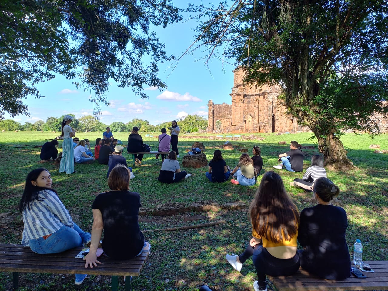 No local, os estudantes receberam explicações sobre o templo e as ruínas e vivenciaram uma atividade de leitura a partir de trechos da obra O Tempo e o Vento, cuja narrativa representa o espaço da redução jesuítica.