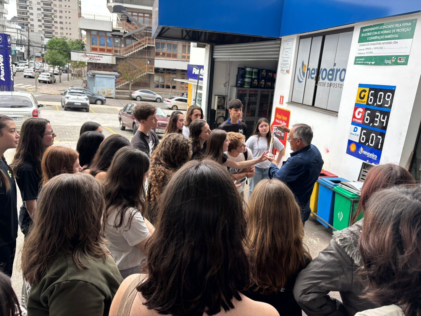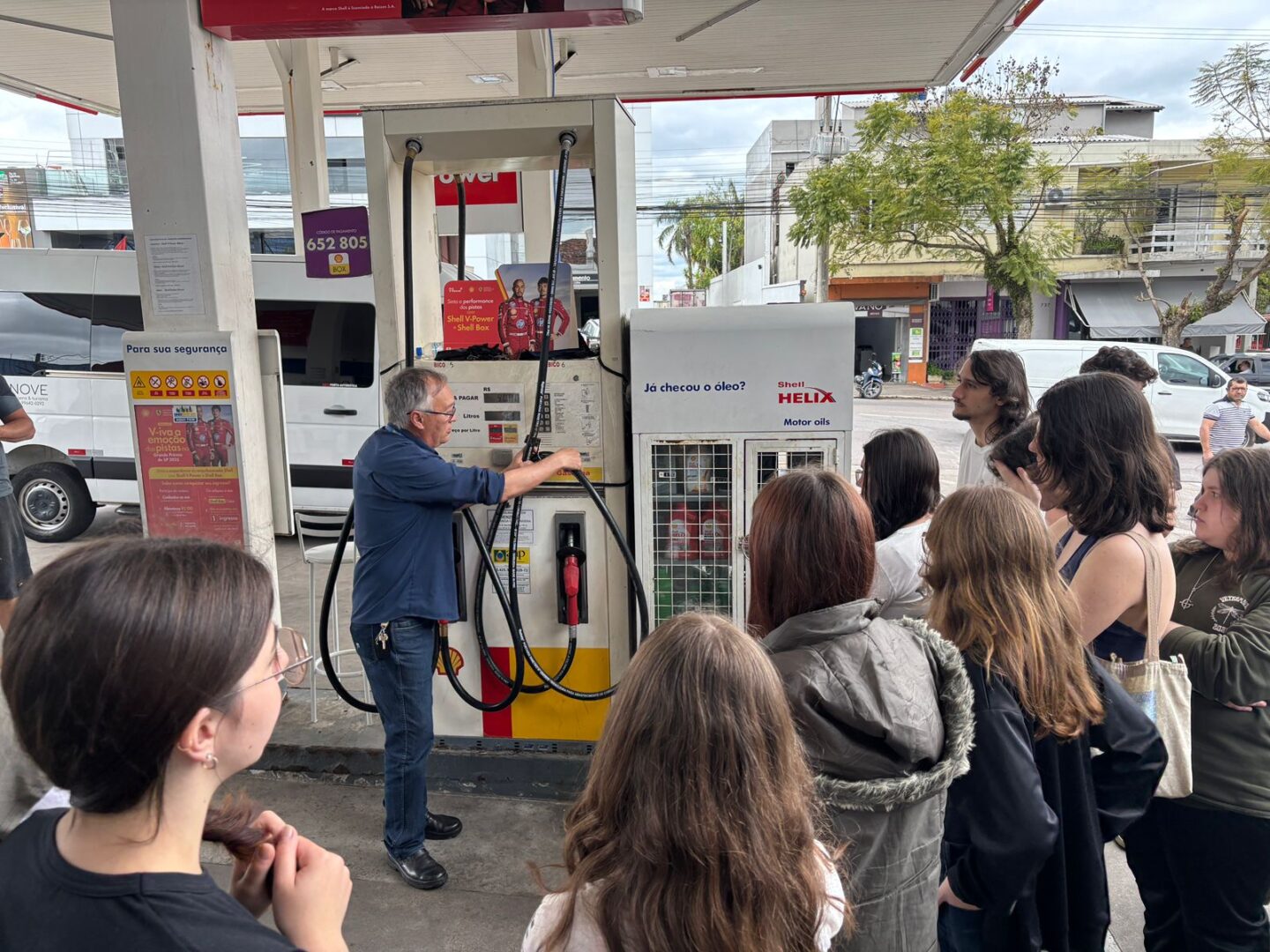 Os estudantes foram acompanhados pelo gerente João Luiz Franke, que realizou o teste de qualidade do combustível e explicou as exigências legais que devem ser cumpridas para a operação de um posto.