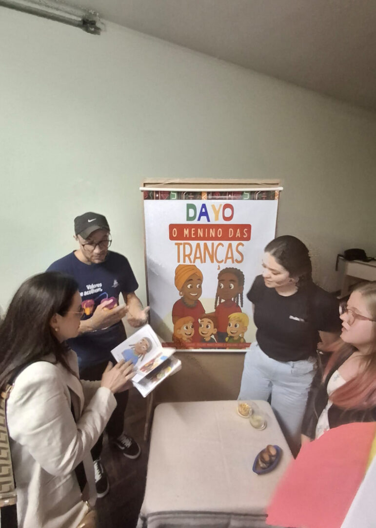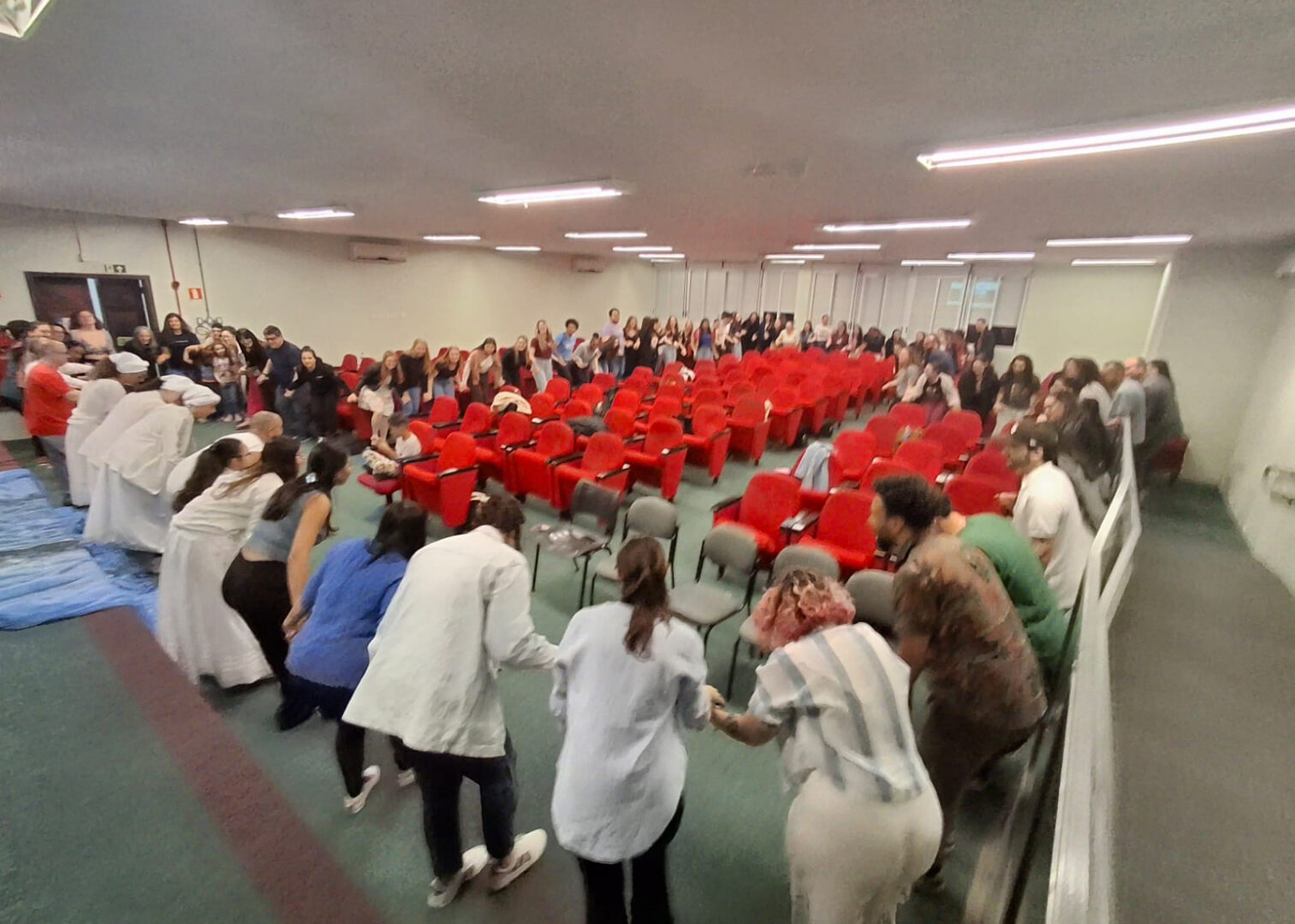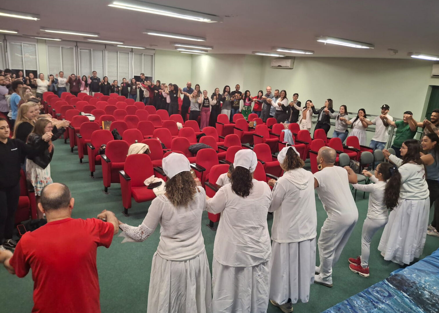 Na sequência, foi realizado um workshop prático, conduzido por estudantes do 5º semestre do curso de Pedagogia, ampliando o diálogo sobre corporalidade, ancestralidade e educação antirracista.