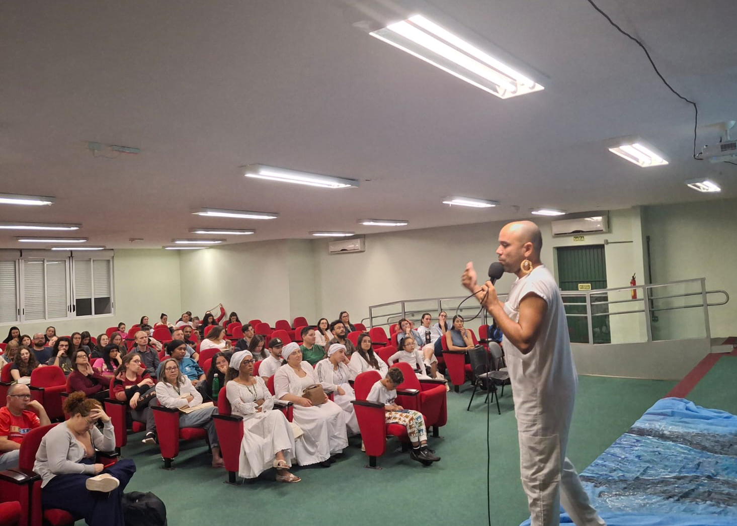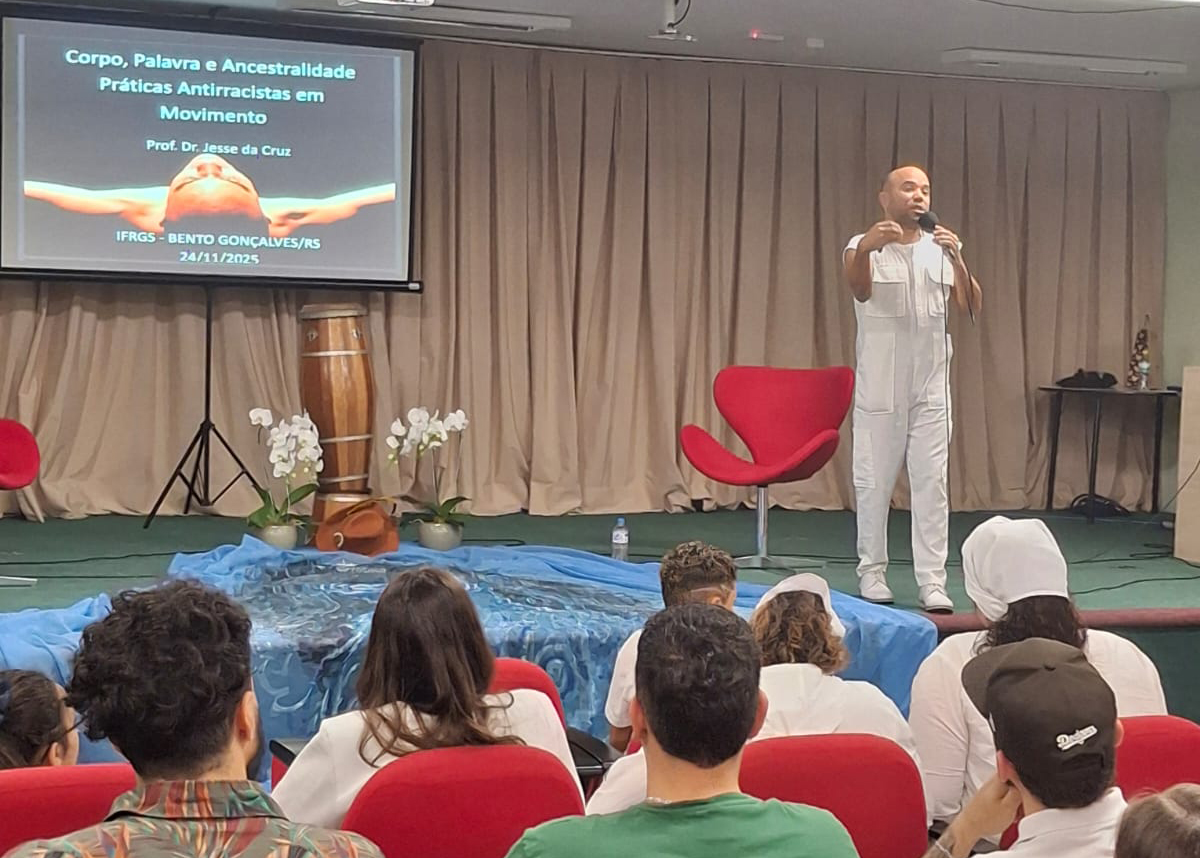 A programação iniciou às 19h, no Salão de Atos do campus, com a palestra “Corpo, Palavra e Ancestralidade: Práticas Antirracistas em Movimento”, ministrada pelo professor Jessé da Cruz, da Universidade Federal de Santa Maria (UFSM).