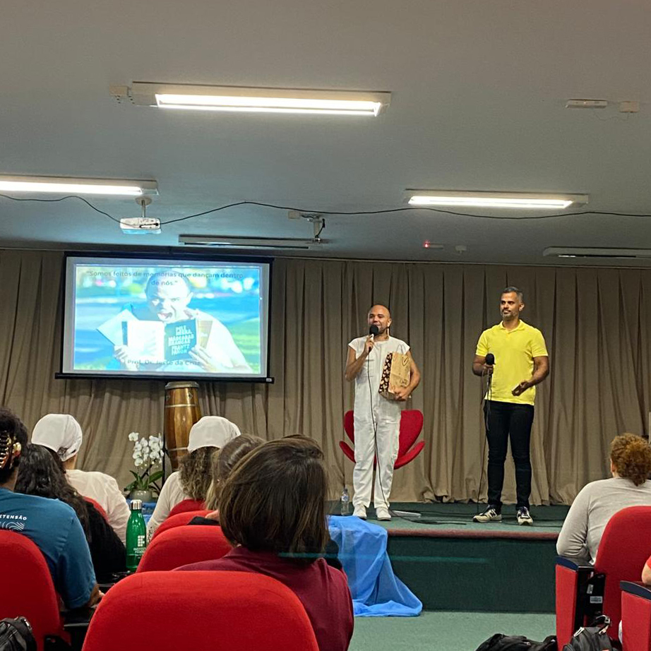 Na sequência, foi realizado um workshop prático, conduzido por estudantes do 5º semestre do curso de Pedagogia, ampliando o diálogo sobre corporalidade, ancestralidade e educação antirracista.