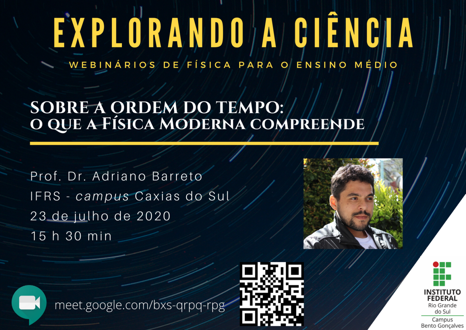 O evento começará às 15h30, com o tema “Sobre a ordem do tempo: o que a Física Moderna compreende”, e terá a participação do professor Adriano Barreto, do Campus Caxias do Sul. A transmissão será realizada pelo Google Meet.
