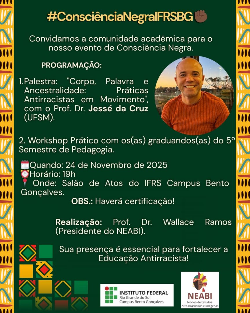 O Núcleo de Estudos Afro-Brasileiros e Indígenas (NEABI) do Campus Bento Gonçalves realizará, no dia 24 de novembro de 2025, um evento alusivo ao Mês da Consciência Negra. A atividade busca fomentar reflexões sobre práticas antirracistas no ambiente acadêmico e fortalecer ações educativas voltadas à equidade racial. As inscrições devem ser feitas pelo formulário eletrônico.