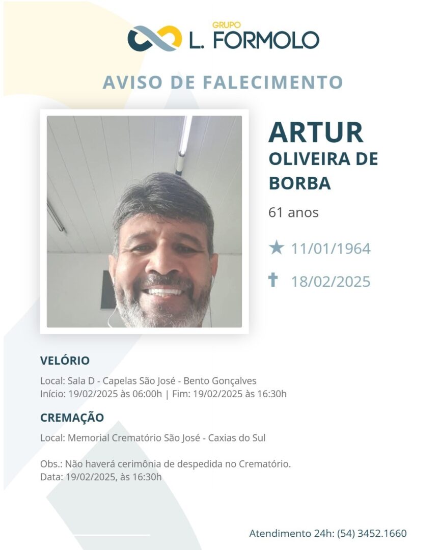 O velório está acontecendo na sala D das Capelas São José, em Bento Gonçalves, até as 16h30 de hoje (19/02), quando acontecerá a cerimônia de despedida.