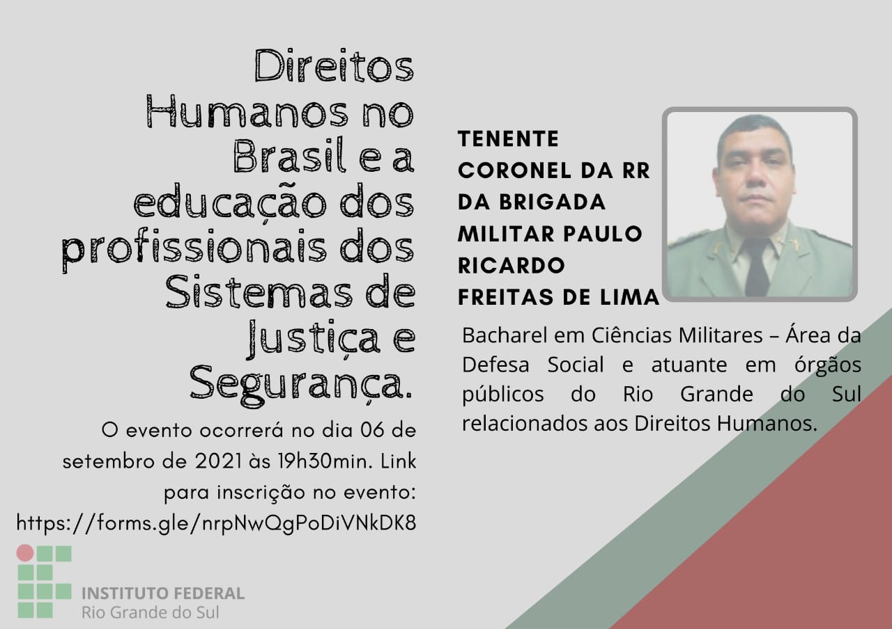 O Projeto de Ensino “Direitos Humanos no Brasil e a educação dos profissionais dos Sistemas de Justiça e Segurança” promove uma palestra com o Tenente Coronel RR da Brigada Militar do RS Paulo Ricardo Freitas de Lima, no dia 6 de setembro, a partir das 19h30, com transmissão ao vivo pelo canal do Campus no YouTube.