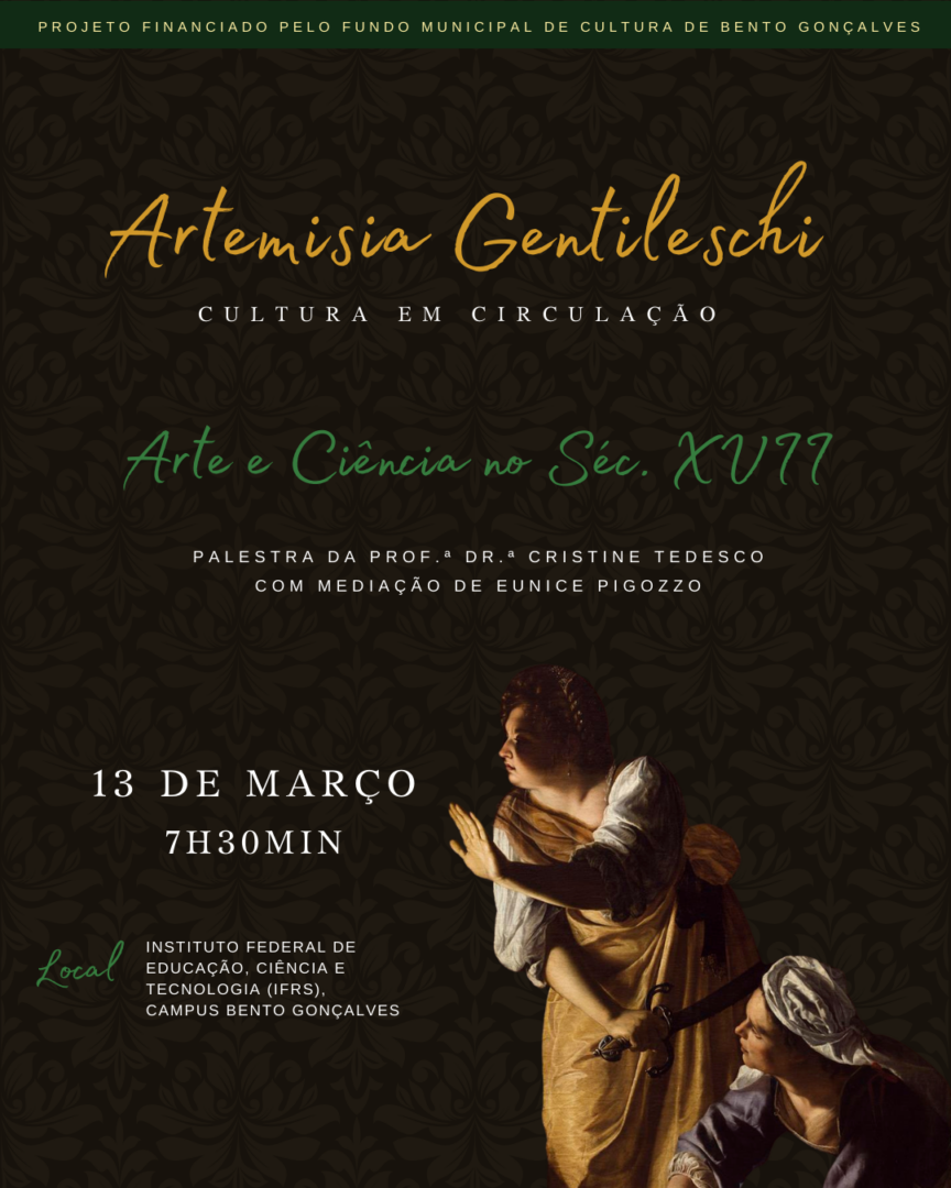 A atividade é alusiva ao Dia Internacional da Mulher, tem o apoio do Núcleo de Integração do Ensino, Pesquisa e Extensão das Ciências Humanas (Niepech) e do Núcleo de Estudos e Pesquisa em Gênero e Sexualidade do Campus Bento Gonçalves (Nepgs BG), e integra o projeto “Artemisia Gentileschi — cultura em circulação”, financiado pelo Fundo Municipal de Cultura de Bento Gonçalves.