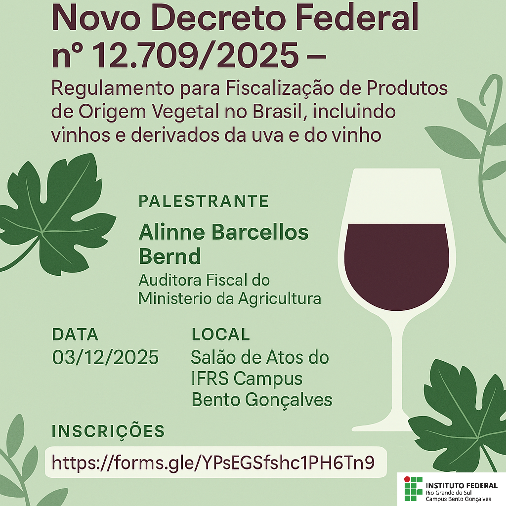 A palestrante Alinne Barcellos Bernd, auditora fiscal do Ministério da Agricultura apresentará as principais mudanças trazidas pelo Decreto Federal nº 12.709/2025, que estabelece o novo regulamento para fiscalização de produtos de origem vegetal. A palestra abordará impactos para produtores, importadores e comerciantes, com destaque para vinhos e derivados da uva e do vinho.