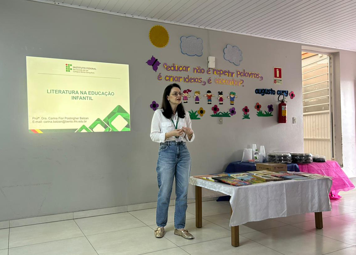 A atividade foi ministrada pela professora Carina Fior Postingher Balzan, do Campus Bento Gonçalves, e abordou a importância da literatura para o desenvolvimento integral das crianças, além de apresentar critérios para a seleção de obras literárias adequadas às diferentes etapas da Educação Infantil e práticas de contação de histórias.
