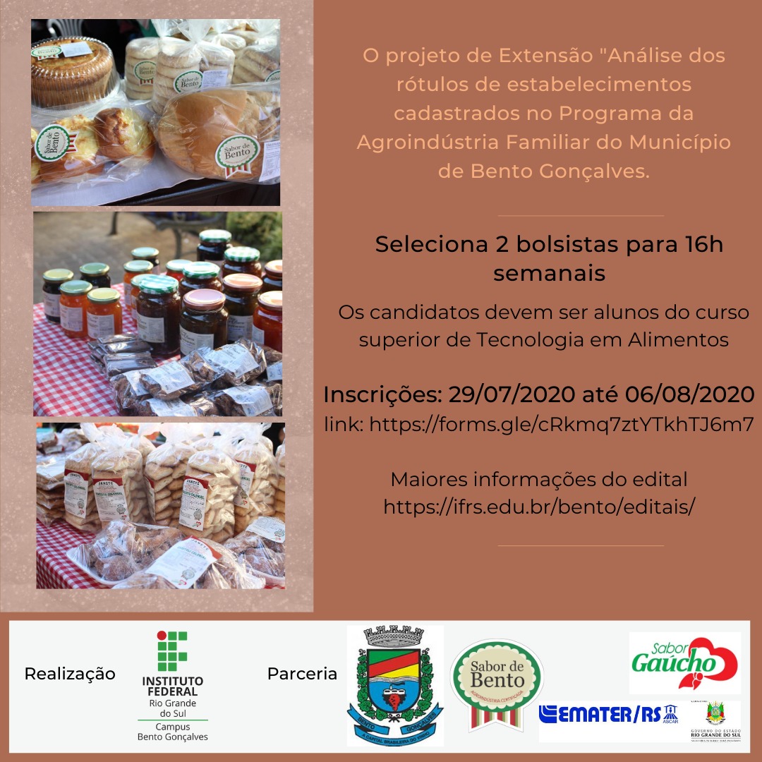 O objetivo geral do projeto é realizar um trabalho junto à Comunidade de Bento Gonçalves, atendendo as agroindústrias familiares e contribuir para a formação dos alunos da Tecnologia em Alimentos do IFRS – Campus Bento Gonçalves. O projeto atenderá 11 agroindústrias familiares do Programa Municipal de Agroindústria Familiar do Município de Bento Gonçalves/Selo Sabor de Bento, verificando a conformidade de seus rótulos com a legislação vigente. Participam do projeto de forma remota 08 bolsistas voluntários de extensão e serão selecionados mais 02 bolsistas remunerados de extensão, todos alunos do Curso de Tecnologia em Alimentos. Todos as atividades serão realizadas de forma não presencial, onde teremos reuniões online semanais com os alunos e membros do projeto.