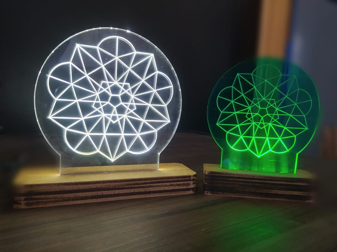Luminárias em acrílico com o desenho de Fractal, desenvolvidas pelas estudantes Thayná Barbosa e Camille Vitória.