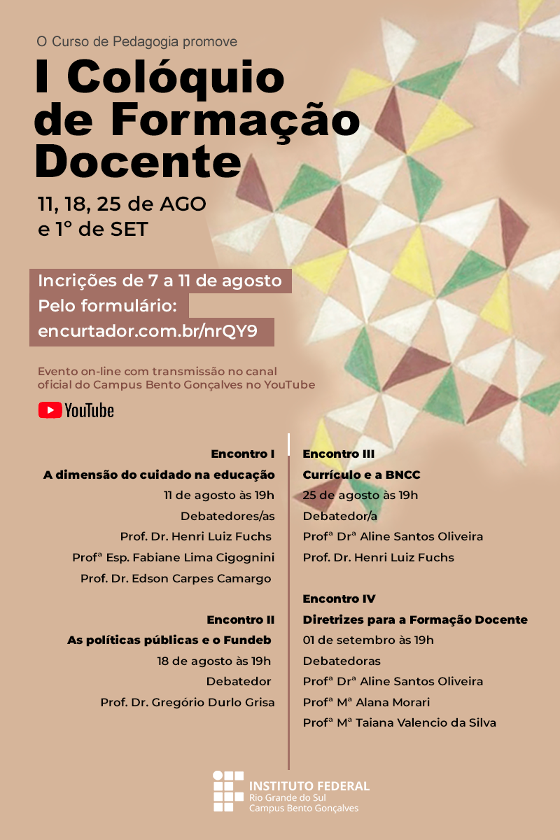 Encerra hoje o prazo de inscrição para o I Colóquio de Formação Docente. O evento on-line será transmitido pelo canal oficial do Campus Bento Gonçalves no YouTube. As inscrições devem ser realizadas pelo Formulário On-line.