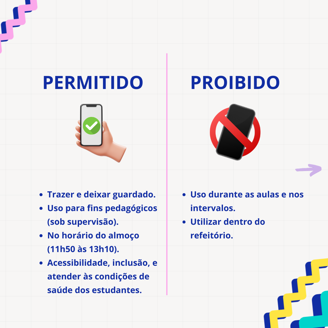 Por outro lado, fica proibido o uso do celular durante as aulas e nos demais intervalos, bem como dentro do refeitório. Nas salas de aula, os aparelhos devem permanecer desligados e guardados na mochila ou na bolsa, sob a responsabilidade do próprio estudante.