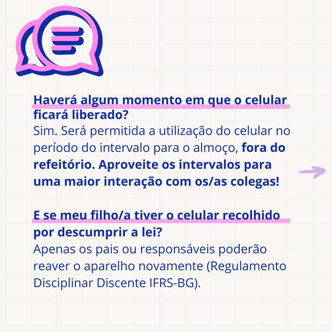 Em caso de descumprimento da norma, o aparelho poderá ser recolhido e devolvido apenas aos pais ou responsáveis, conforme previsto no Regulamento Disciplinar Discente do IFRS-BG.