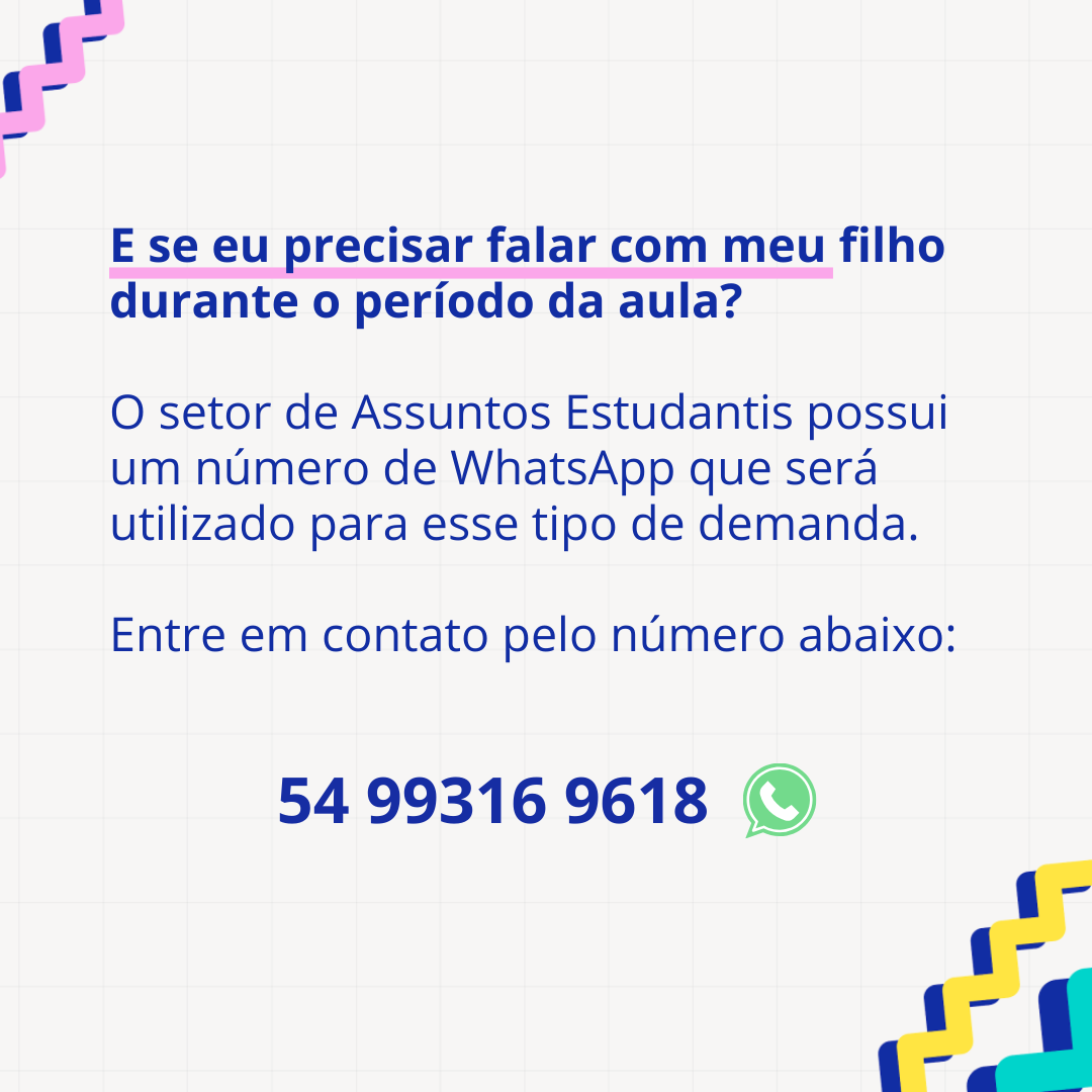 Para situações emergenciais, como a necessidade de contato com estudantes durante o período das aulas, o setor de Assuntos Estudantis disponibiliza atendimento via WhatsApp pelo número (54) 99316-9618.
