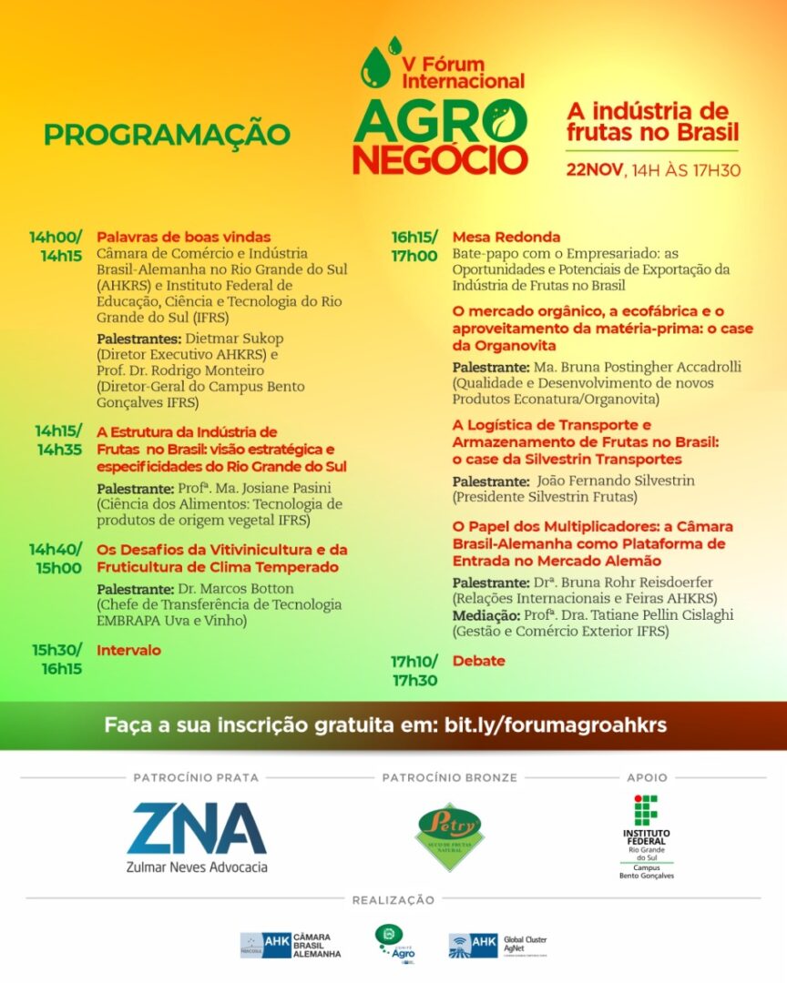 O “V Fórum Internacional – AgroNegócio: A indústria de frutas no Brasil” será realizado no Campus Bento Gonçalves do IFRS, no dia 22 de novembro de 2022, das 14 às 17h30, no Salão de Atos.