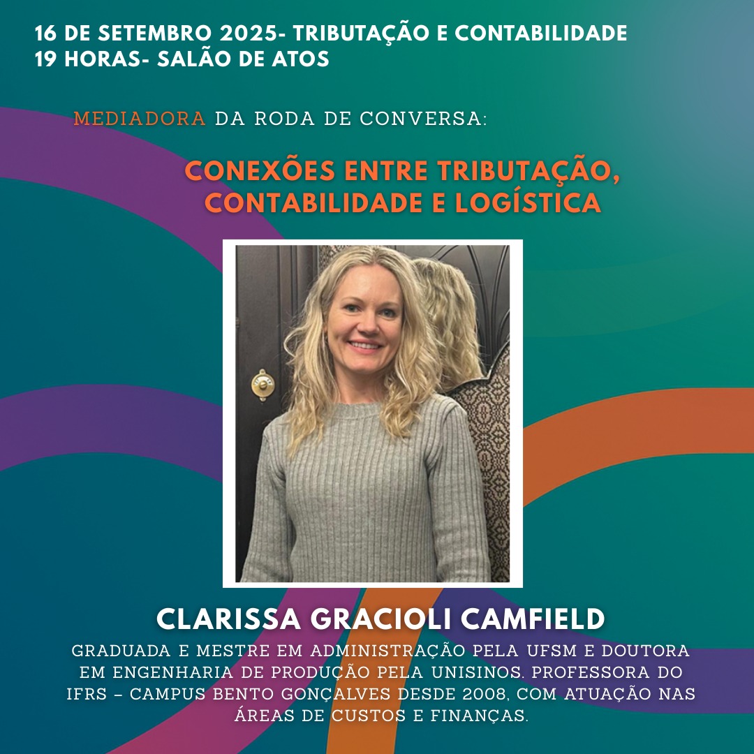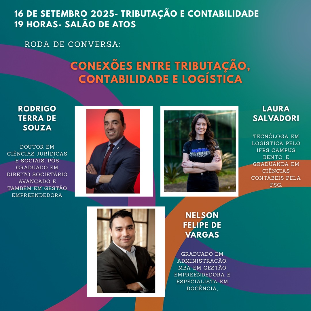 No dia 16, o tema em destaque será “Tributação e Contabilidade” com a roda de conversa “Conexões entre Tributação, Contabilidade e Logística”. O debate contará com a presença de Rodrigo Terra de Souza (Doutor em Ciências Jurídicas), Laura Salvadori (Tecnóloga em Logística pelo IFRS e graduanda em Contábeis) e Nelson Felipe de Vargas (MBA em Gestão Empreendedora). A conversa será mediada pela professora Clarissa Gracioli Camfield (Doutora em Engenharia de Produção).