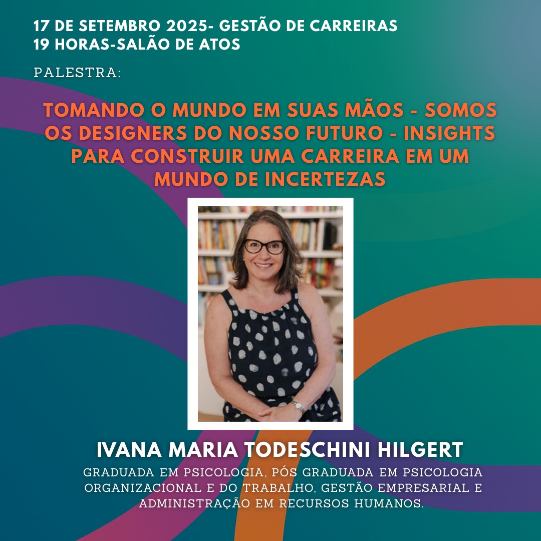 A noite do dia 17 será dedicada à “Gestão de Carreiras” com a palestra “Tomando o Mundo em Suas Mãos – Somos os Designers do Nosso Futuro”, que trará insights para construir uma carreia em um mundo de incertezas. A palestrante será Ivana Maria Todeschini Hilgert, psicóloga com pós-graduação em Psicologia Organizacional e Gestão Empresarial.