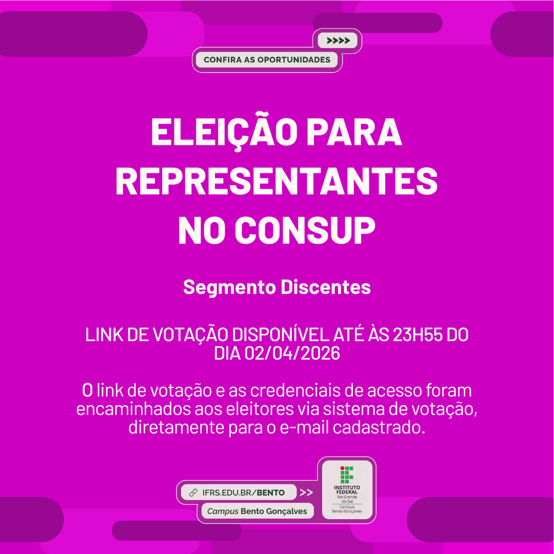 A Comissão Eleitoral Permanente do Campus Bento Gonçalves (CEP-BG) do Instituto Federal de Educação, Ciência e Tecnologia do Rio Grande do Sul (IFRS) informa que a eleição para representante do Consup para o segmento Discente estará disponível hoje, 02 de abril de 2026, até às 23h55min. O link de votação, bem como as credenciais de acesso, foram encaminhados aos eleitores por intermédio do próprio sistema de votação, diretamente para o e-mail cadastrado. O remetente deste sistema será no-reply@mail.heliosvoting.org. Para detalhes de como fazer a votação, a comissão eleitoral elaborou o GUIA DE VOTAÇÃO .