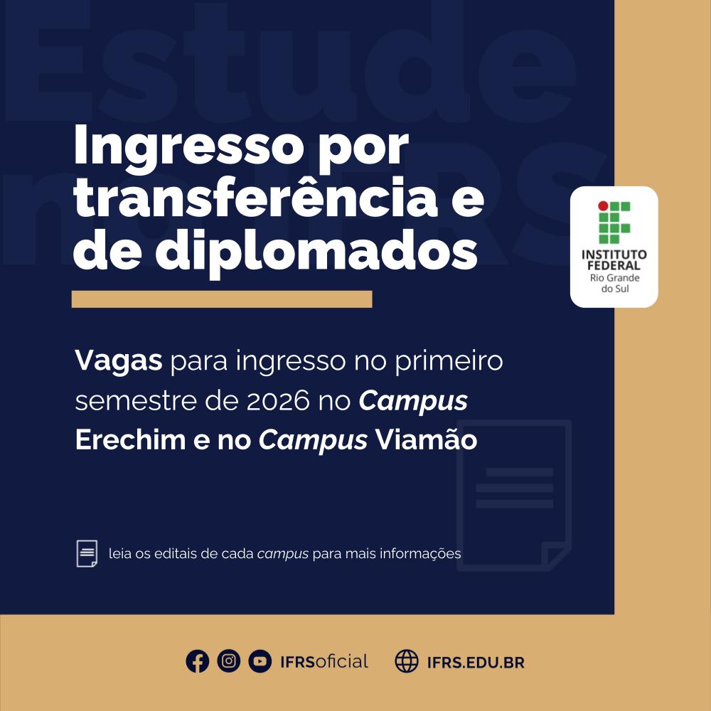 Essa oportunidade é para os interessados em estudar no Instituto Federal de Educação, Ciência e Tecnologia do Rio Grande do Sul (IFRS) por transferência ou ingresso de diplomados. Os campi Erechim e Viamão ofertam vagas para essas modalidades de ingresso em cursos superiores de graduação e/ou em técnicos subsequentes ao ensino médio.