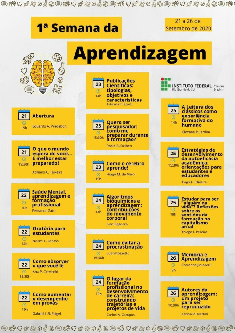 “O que o mundo espera de você?”, “Como absorver o que você lê”, “Saúde mental, aprendizagem e formação profissional”, “Como o cérebro aprende”… Essas e outras reflexões serão promovidas na I Semana da Aprendizagem, evento aberto à toda comunidade do Instituto Federal do Rio Grande do Sul e promovido pelo Campus Erechim.