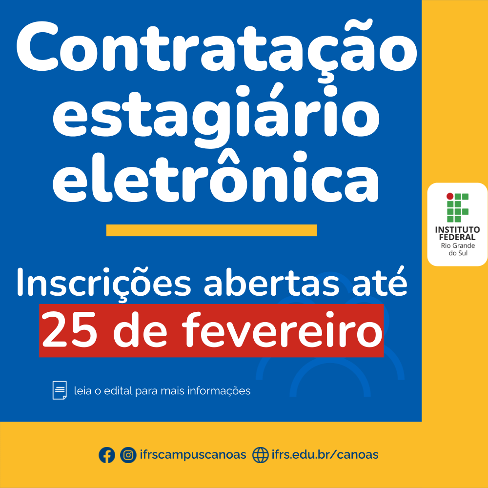 De 10 a 25 de fevereiro, é possível se inscrever para trabalhar junto ao laboratório de eletrônica do Campus Canoas como estagiário. A oportunidade é de 01 (uma) vaga, com 20h semanais (4h diárias), para estudantes de nível médio. É preciso que o candidato esteja cursando o técnico em eletrônica, ter 18 anos e disponibilidade para trabalhar das 18h30min às…