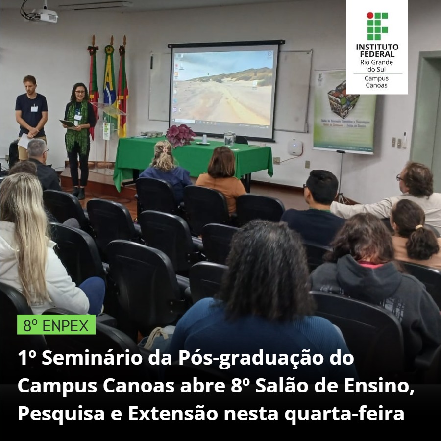 Na manhã desta quarta-feira, dia 29 de outubro, o I Seminário da Pós-graduação do Campus Canoas de início aos trabalhos da 8ª edição do Salão de Ensino, Pesquisa e Extensão (Enpex). O evento ocorre entre os dias 29 e 31 de outubro. Os trabalhos seguem sendo apresentados à tarde (veja programação) e a abertura oficial será às 19h, com palestra do professor Eliezer Pacheco, um dos idealizadores dos Institutos Federais. Neste ano, a temática do evento será “15 anos do Campus Canoas: trajetórias de inclusão, diversidade, sustentabilidade e resiliência”.