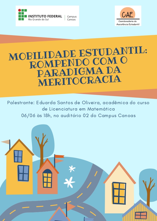 Na quinta-feira, 6 de junho, no auditório 2, acontecerá a palestra intitulada ‘Mobilidade Estudantil: rompendo com o paradigma da meritocracia’. A ministrante é a discente Eduarda Santos Oliveira, acadêmica do curso superior de Licenciatura em Matemática. A ação é realizada em parceria com a Coordenadoria de Assistência Estudantil (CAE) do Campus Canoas.