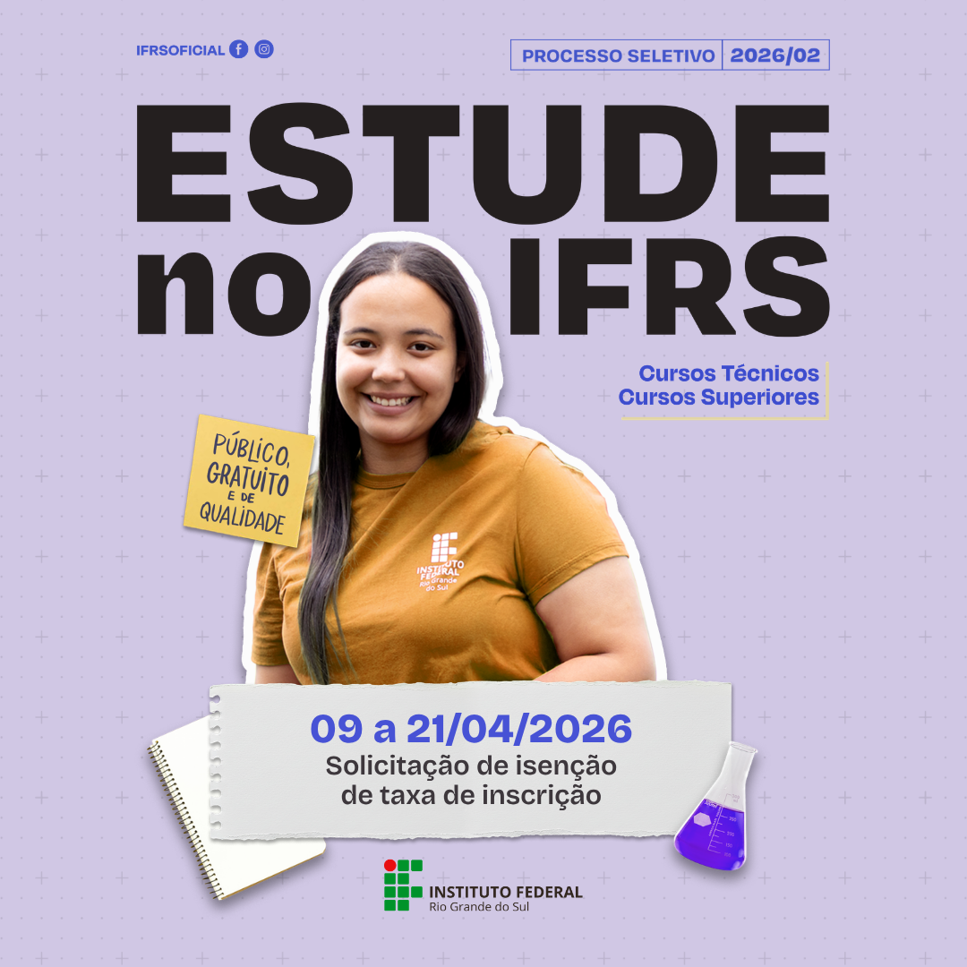 IMPORTANTE: Mesmo fazendo o pedido de inscrição gratuita será necessário realizar a inscrição no Processo Seletivo (não importa se o pedido foi aceito ou não). A inscrição no Processo Seletivo ocorrerá pelo site ingresso.ifrs.edu.br, de 23 de abril a 04 de maio de 2026. Após finalizá-la, será gerado o comprovante de isento (para aqueles que não precisarão pagar a taxa) ou então um boleto bancário (para quem não teve o pedido de gratuidade aceito ou não solicitou e deverá pagar).