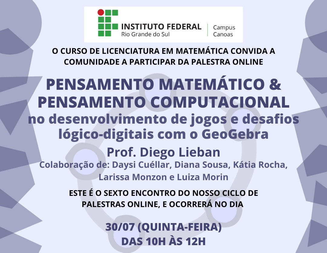 Seguindo com seu ciclo de palestras, o curso superior de Licenciatura em Matemática do Campus Canoas trouxe nesta quinta-feira sua sexta palestra virtual. Foi ministrante o professor Diego Lieban. Ele teve a colaboração de Daysi Cuéllar, Diana Sousa, Kátia Rocha, Larissa Monzon e Luiza Morin. O tema foi Pensamento Matemático & Pensamento Computacional no Desenvolvimento de Jogos e Desafios Lógico-digitais com o Geogebra. As palestras ocorrem a cada duas quintas-feiras, às 10h. E já está confirmada a próxima palestra, no dia 13/08. O título será O projeto Livro Aberto de Matemática e o Pensamento Computacional, com o professor Leonardo Barichello.