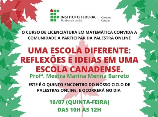 Seguindo com seu ciclo de palestras, o curso superior de Licenciatura em Matemática do Campus Canoas trouxe nesta quinta-feira a professora Marina Menna Barreto. No encontro online ela falou sobre sua experiência como professora em uma escola privada no Canadá. A instituição tem buscado alternativas ao sistema tradicional de ensino, inovando principalmente na maneira em que estrutura o currículo e oferece uma variedade de opções para os alunos em termos acadêmicos e não acadêmicos. A professora Marina, que também tem experiência como professora de Ensino Fundamental e Médio no Brasil, trouxe exemplos de atividades de sucesso que podem ser repetidas ou adaptadas em escolas em diferentes partes do mundo. As palestras do ciclo ocorrem a cada duas quintas-feiras, às 10h. A próxima está marcada para o dia dia 30 de julho.