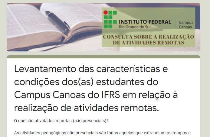A partir de um vídeo explicativo do pró-reitor de Ensino do IFRS, Lucas Coradini, os estudantes do Campus Canoas são convidados a dar informações sobre como estão vivendo o momento, se têm acesso e familiaridade com determinadas ferramentas digitais, entre outras questões. As informações serão mantidas em sigilo. A ação visa a auxiliar os gestores do instituto no planejamento de estratégias para a retomada das aulas e a recuperação dos conteúdos. Acesse o vídeo e a pesquisa aqui