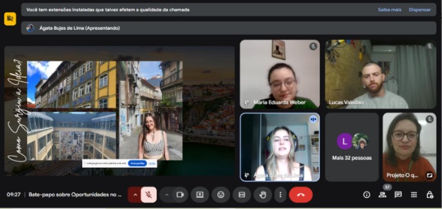 Ágata Bujes de Lima compartilhou sua experiência de 5 anos na cidade do Porto/Portugal, estudando Arquitetura e Urbanismo; Augusto Falcão Flach realizou intercâmbio na Irlanda e hoje trabalha em uma empresa daquele país em formato 100% remoto; Brenda Nogueira, após realizar graduação e mestrado em Portugal, está, atualmente, cursando o Doutorado em Ciência de Dados, nos Estados Unidos; Lucas Valadão aproveitou uma oportunidade para trabalhar como eletricista autônomo em Gaia/Portugal; Maria Eduarda Weber trabalhou e estudou em Dublin e hoje, de volta ao Brasil, atua como professora de inglês; e Mateus Colares de Souza contou sobre sua trajetória na música e os caminhos que o levaram à oportunidade de estudar Bacharelado em Oboé em Londres/Inglaterra, atualmente.