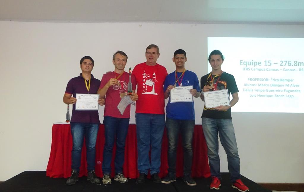A medalha de ouro da XVII Jornada de Foguetes, evento nacional ocorrido este ano em Barra do Piraí (RJ), foi conquistada por uma equipe de estudantes do Campus Canoas do IFRS. Foram 45 equipes de Ensino Médio participantes, sendo a do Campus Canoas que a única do Rio Grande do Sul. A equipe conseguiu o primeiro lugar. Como prêmio, recebeu um DVD do filme “Os Eleitos”. O evento ocorreu entre os dias 30 de outubro e 2 de novembro.