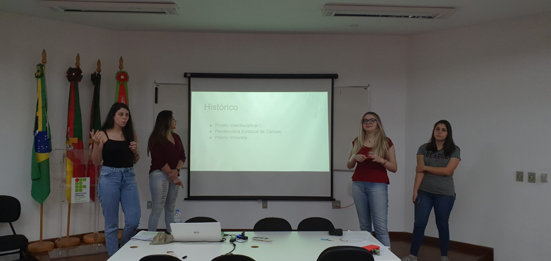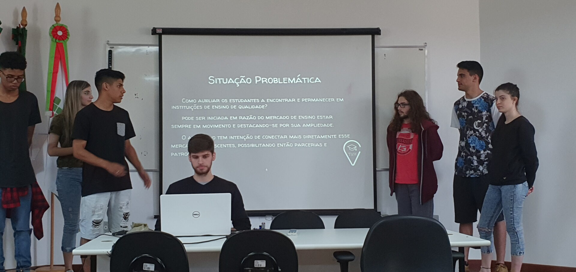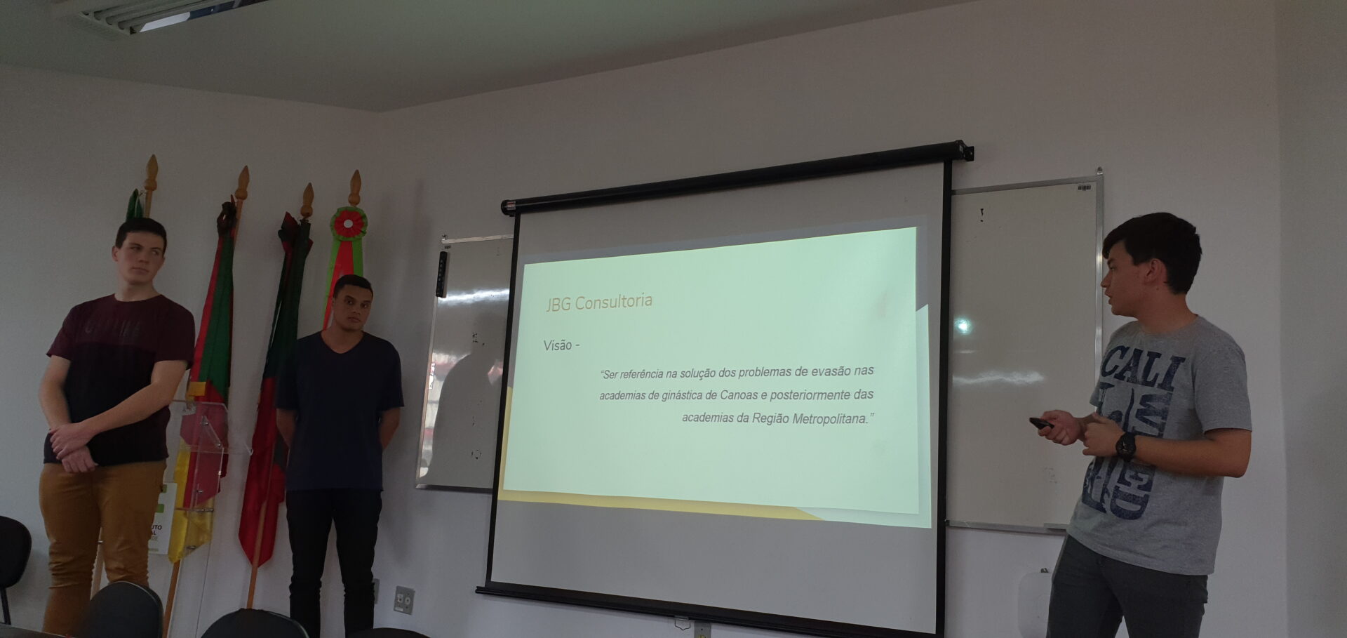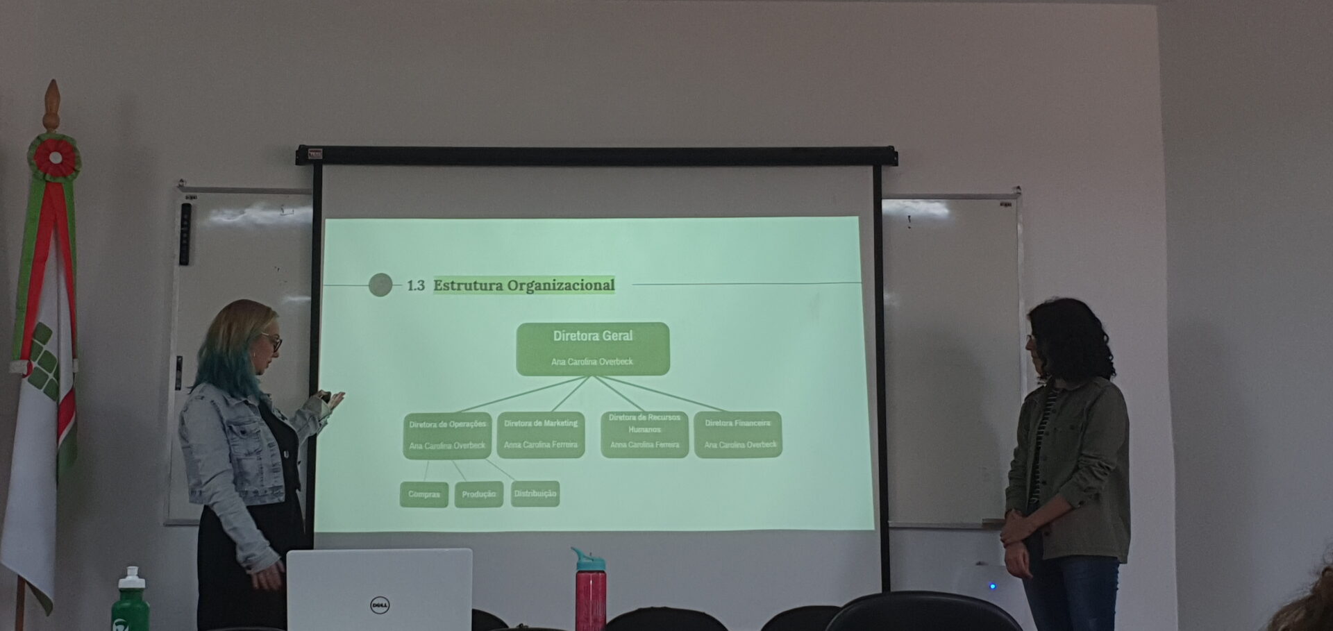 Os presentes degustaram salchipão e, logo após, ocorreram apresentações dos projetos de pesquisa e modelos de negócio, ministradas pelos estudantes.