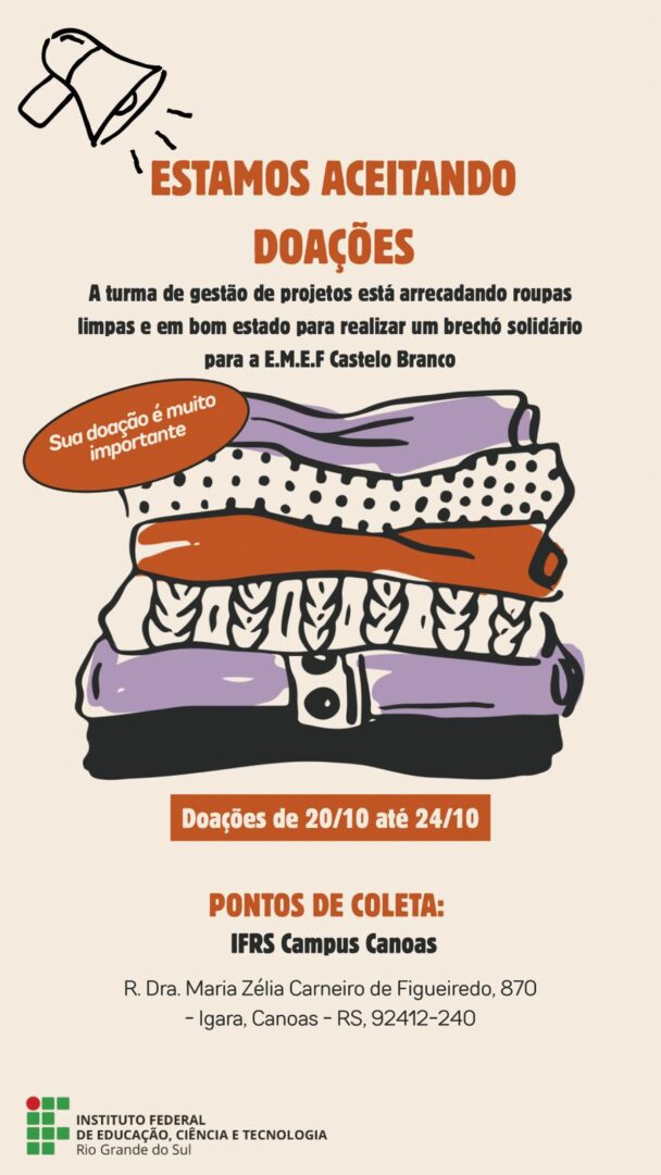 O Campus Canoas, por intermédio da turma de Gestão de Projetos, está recebendo doações de roupas limpas e em bom estado de conservação.