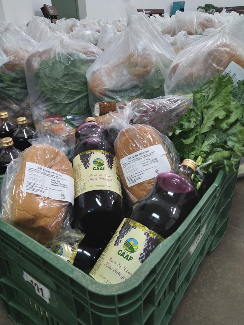Compõem o kit produtos agroecológicos, provenientes da agricultura familiar e, dentre estes, estão frutas, grãos, farinhas, legumes e sucos naturais.