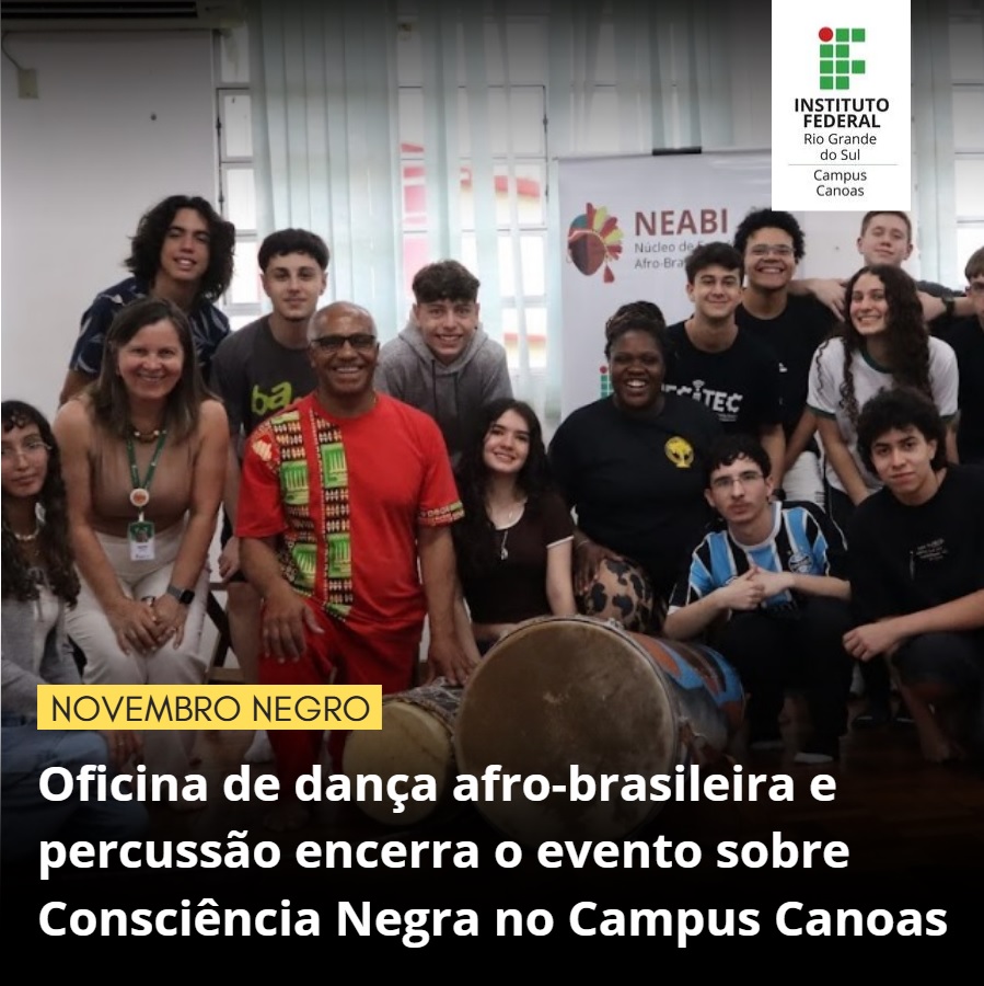 O Núcleo de Estudos Afro-brasileiros e Indígenas (Neabi) do Campus Canoas promoveu, nesta quarta e quinta-feira, dias 5 e 6 de novembro, diversas atividades em alusão ao Novembro Negro e pertinentes aos tradicionais eventos relativos à Consciência Negra. O evento ocorreu no campus. A oficina “Oficina Teórico-Prática de Dança Afro-Brasileira e Percussão“, ministrada pelo Mestre Griô Dilermando Freitas e Priscila…