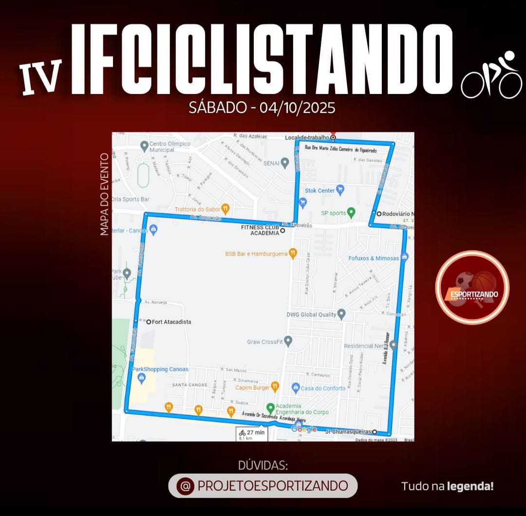 O projeto extensionista Esportizando promove no próximo sábado, 04 de outubro, a quarta edição do IFciclistando. A ação tem por objetivo integrar toda a comunidade acadêmica em um dia repleto de esporte, saúde e coletividade. O ponto de encontro é no Parque Getúlio Vargas (Capão do Corvo), às 8h30min. A atividade inicia com alongamento, às 9h e depois, às 9h30min…