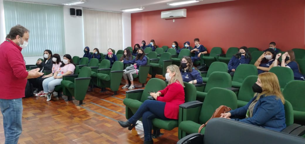 Participaram do encontro a Diretora-Geral, Patrícia Nogueira Hübler, o Coordenador de Extensão, Marcos Daniel Schmidt Aguiar e a Diretora da EMEF Sete de Setembro, Tatiana Valente, além do professor Alysson Bentlin.