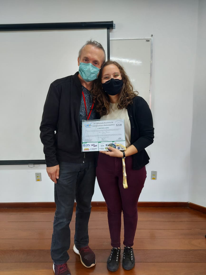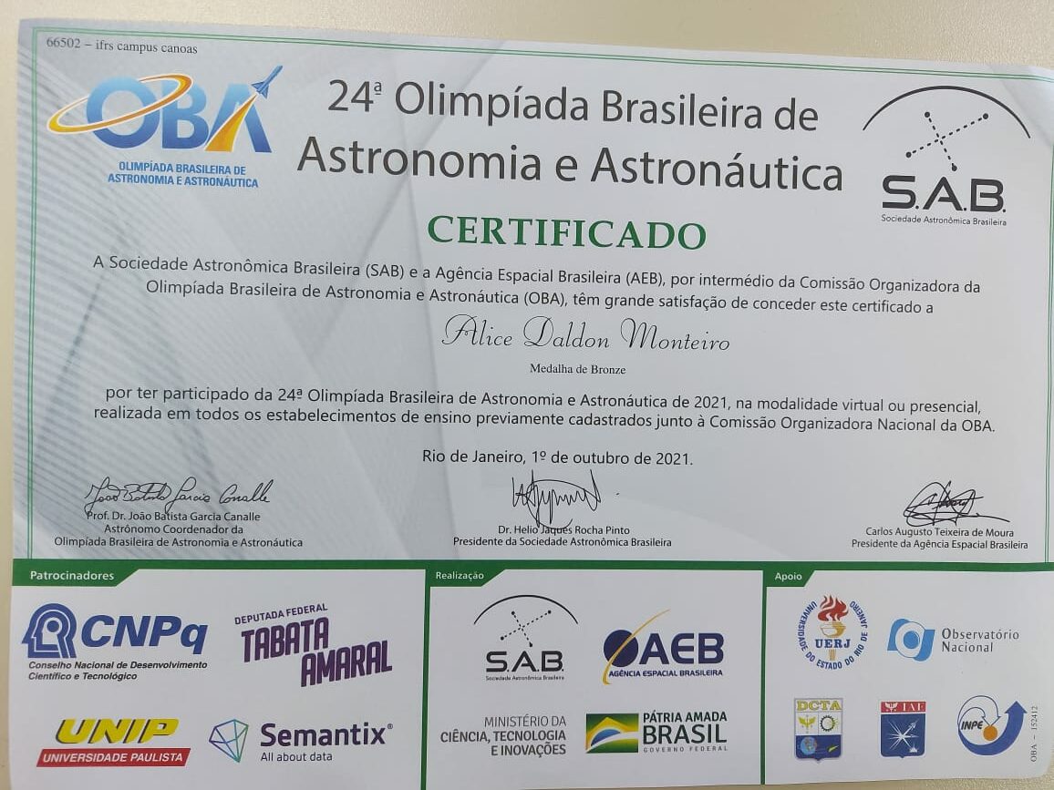 A estudante do Curso Técnico em Administração Integrado ao Ensino Médio do Campus Canoas, Alice Daldon Monteiro, foi agraciada com medalha de bronze na edição 2021 da Olimpíada Brasileira de Astronomia e Astronáutica (OBA).