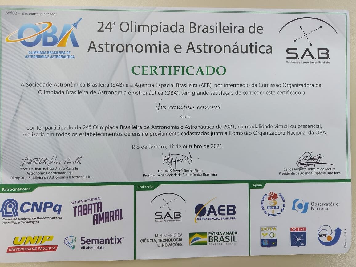 A atividade aconteceu em 28 de maio do ano passado, envolvendo mais de 9 mil escolas e quase meio milhão de participantes. Em virtude da pandemia de coronavírus, os estudos preparatórios para a OBA ocorreram virtualmente. O Campus Canoas participou com 10 estudantes.