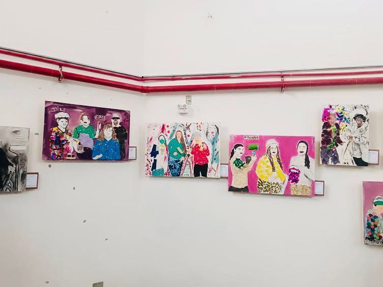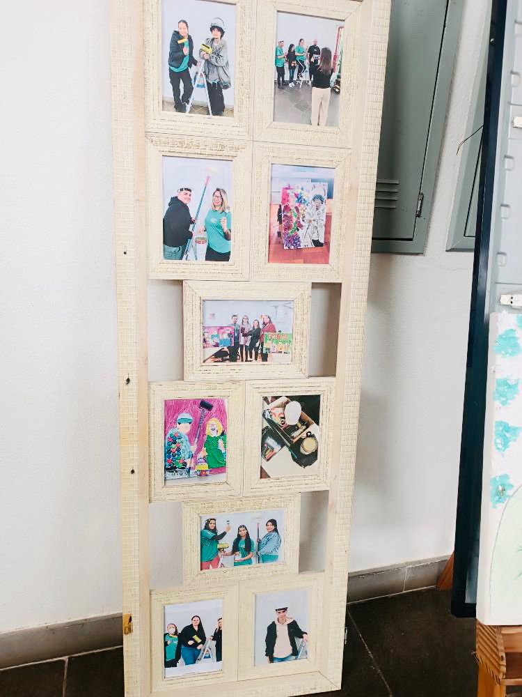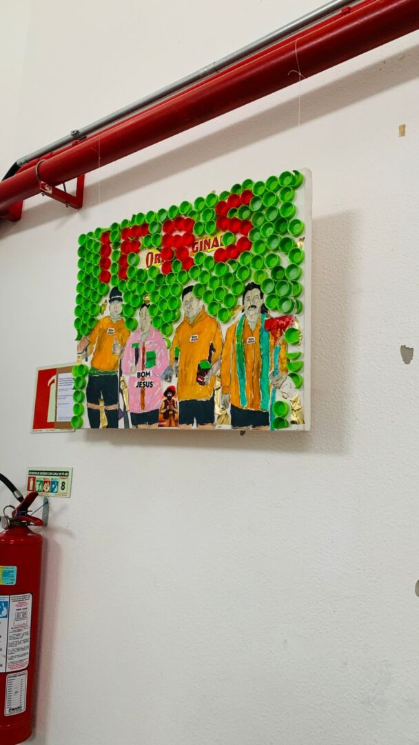 Telas reproduzem retratos dos estudantes de Pintor Industrial decorados com resíduos. A turma faz parte do Programa Autonomia e Renda Petrobras