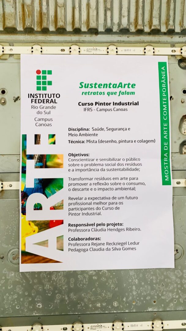 Obras que revelam sonhos, identidade e consciência ambiental estão à mostra na exposição “SustentaArte – Retratos que falam”, aberta à visitação de estudantes e servidores no Bloco A do Campus Canoas do Instituto Federal de Educação, Ciência e Tecnologia do Rio Grande do Sul (IFRS) até sexta-feira, 03 de outubro. A mostra conta com dez telas decoradas com resíduos que reproduzem retratos dos estudantes do curso de Pintor Industrial utilizando equipamentos de proteção individual e utensílios necessários para o trabalho de pintura industrial. No local, é possível conferir ainda fotos dos bastidores de construção das obras.