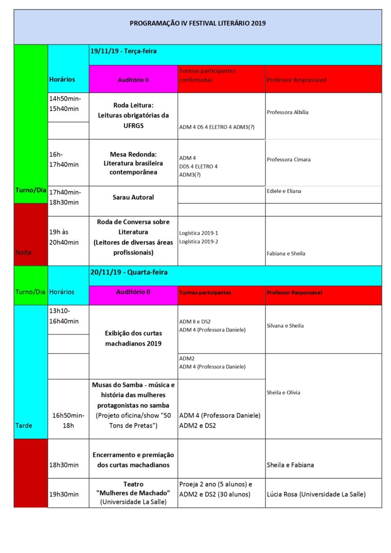 O evento inicia na tarde do dia 19/11 com o Roda Leitura, que terá como temática norteadora as leituras obrigatórias da UFRGS. Logo após, a literatura brasileira contemporânea é o assunto abordado em mesa redonda. Na sequência, teremos o Sarau Autoral, em que os participantes demonstram suas aptidões por meio da escrita. À noite, acontece um roda de conversa que versará sobre literatura.