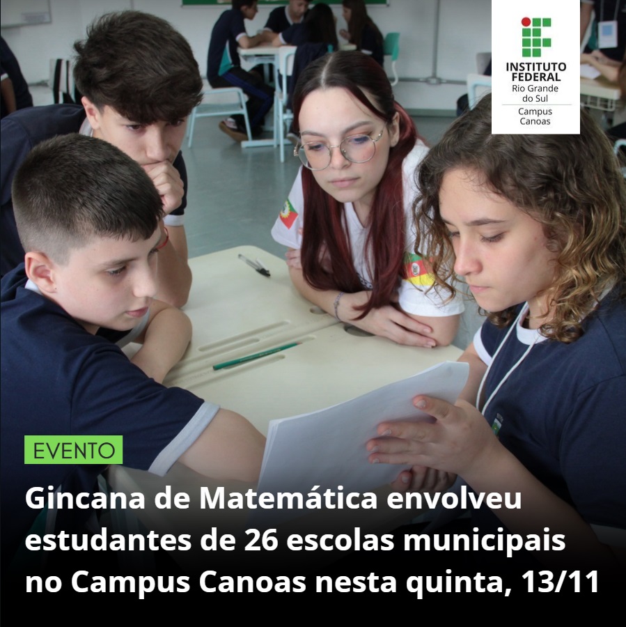 O Campus Canoas do Instituto Federal do Rio Grande do Sul (IFRS) promoveu nesta quinta-feira, dia 13 de novembro, a Gincana da Matemática. Estudantes de 26 escolas canoenses estiveram envolvidos no evento organizado pelo Projeto de Oficinas de Ensino de Matemática (Poema) do campus em parceria com a Secretaria Municipal de Educação de Canoas (SMED). Foi um dia cheio de desafios e muito aprendizado.