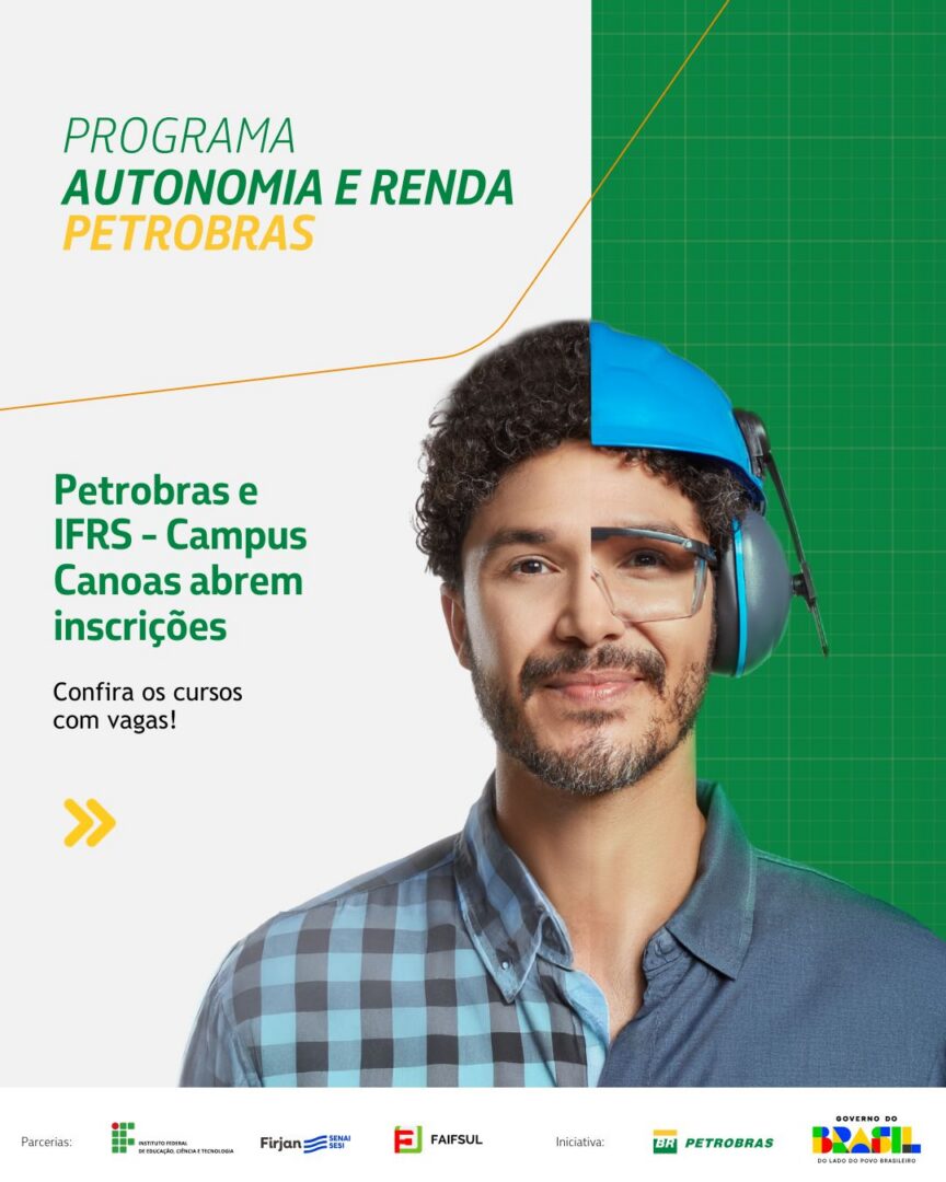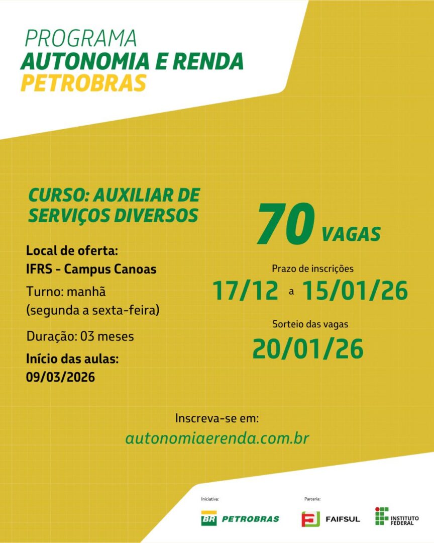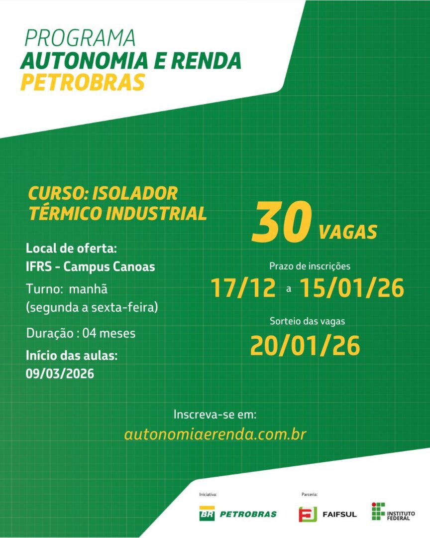 O Programa Autonomia e Renda Petrobras está com inscrições abertas, de 17 de dezembro a 15 de janeiro, para cursos gratuitos que serão realizados em Canoas em parceria entre a Petrobras e o Instituto Federal de Educação, Ciência e Tecnologia do Rio Grande do Sul (IFRS). São duas turmas de “Auxiliar de Serviços Diversos” e uma de “Isolador Térmico Industrial”, somando cem vagas. Os cursos são de Formação Inicial e Continuada (FIC).