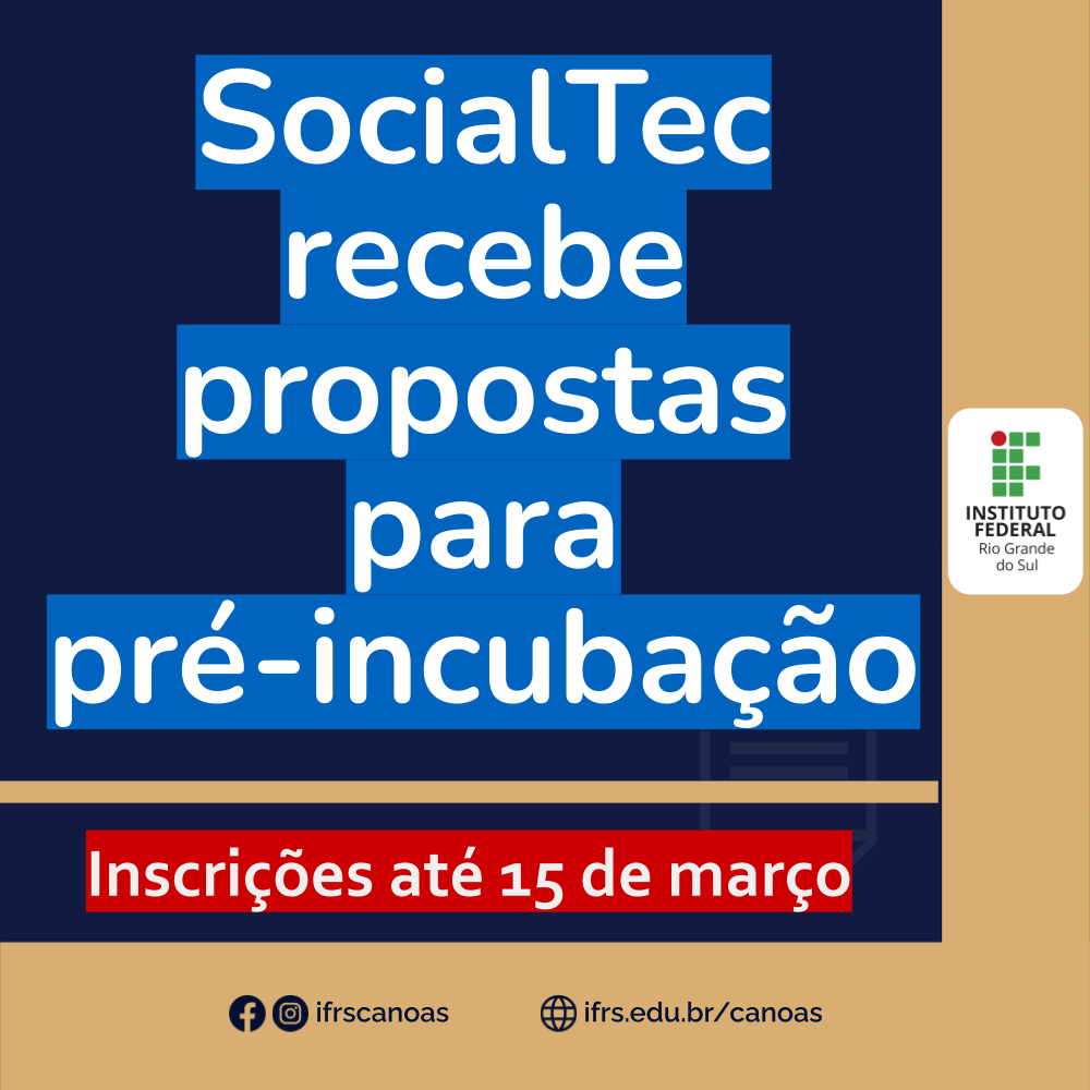 Demais informações podem ser conhecidas por meio do site do campus: https://ifrs.edu.br/canoas/pesquisa-pos-graduacao-e-inovacao/socialtec/incubadora/ e também pelo perfil do instagram da SocialTec: @socialtec_ifrs.